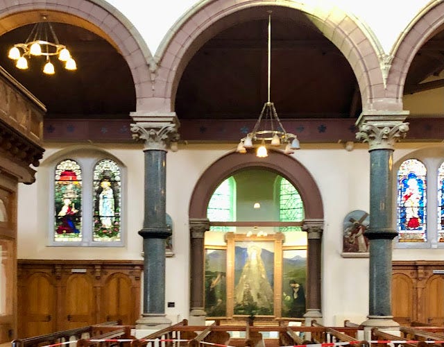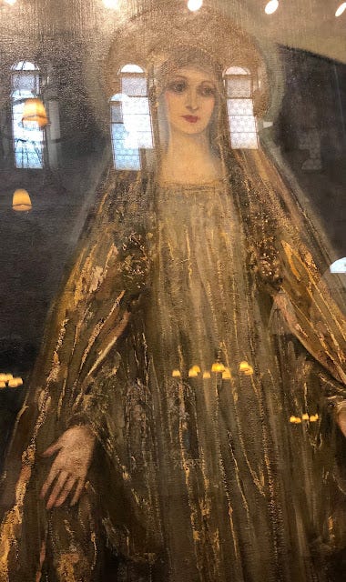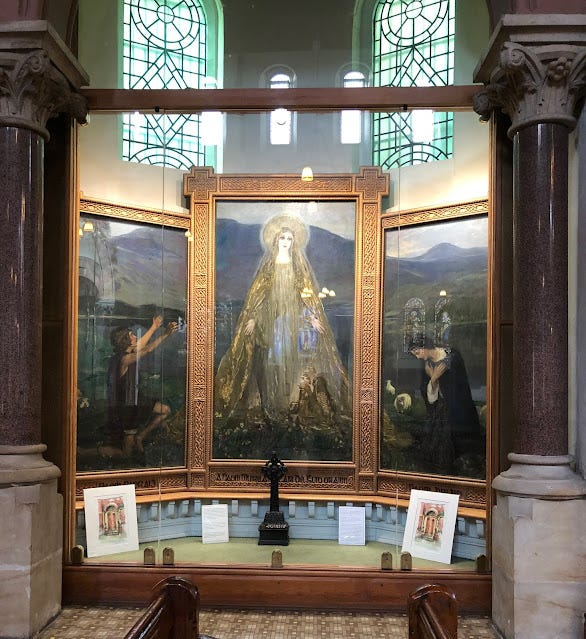 Just as the Great War ended, on the occasion of Hazel converting to Catholicism, John Lavery donated an altar and triptych to his family church, St. Patrick’s. He named the painting Madonna of the Lakes.