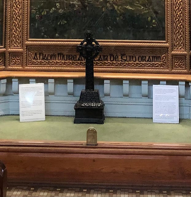 After some time, I realized there was no altar. A triptych like this is meant to rise behind a small altar along the nave. The bog oak cross in the middle is the sort of thing that would stand on a that altar.