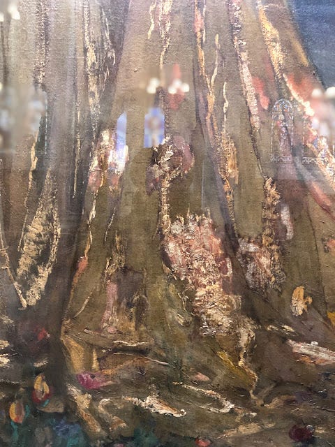 It was only later that I learned that there was an altar, installed in this church at the same time as the painting. It was there as late as 1977 when an art historian mentioned it, but by 1995 when the church burned and this painting was saved, the altar was gone, and no one knows where it is.