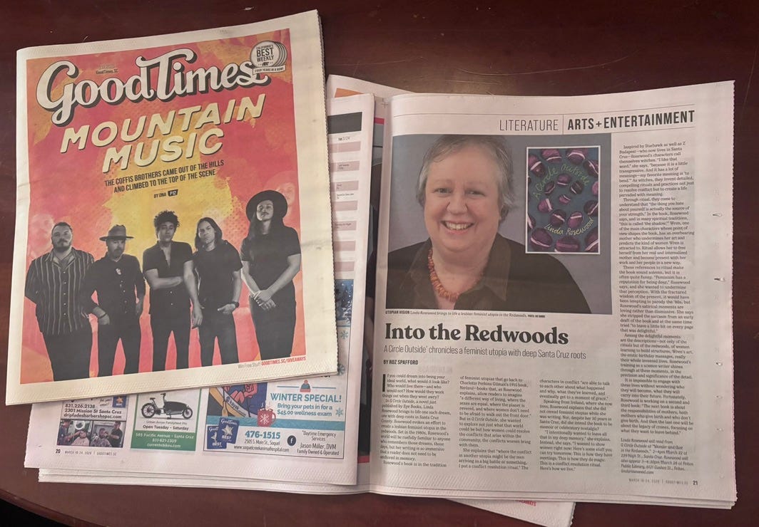 After the stories in the Sentinel and Good Times, many people ordered my book from Bookshop Santa Cruz, but none of them arrived. So the other day I dropped off my remaining copies of A Circle Outside. I can’t even say this is a dream come true. It’s bizarre to see a radical feminist novel in print at all and being sold at Bookshop.
