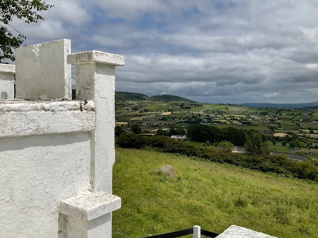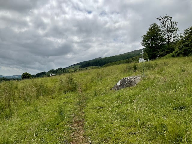 The path leveled off and I looked back at the abbey site, in that grove of trees. This was their view, those meatless women of St. Monnina.