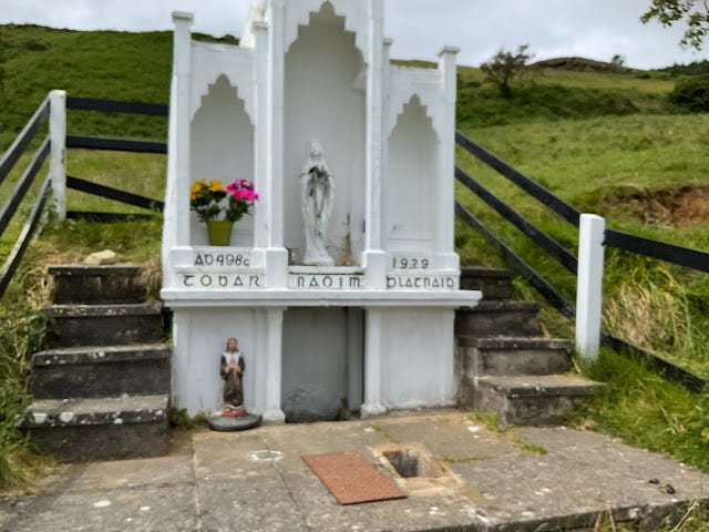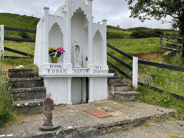 Sacred Ireland says there’s a well “up the lane” but I couldn’t find it until I asked for directions to it from a local man. He pointed to the top of the hill. “See that white cross way up there?”