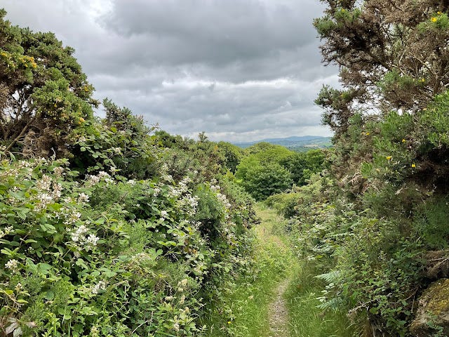 He instructed me to take the shortcut, across that sloping field. I took the other way, and found myself in an ancient pilgrim’s path worn deep between stone walls, cut off from view, and relentlessly steep.