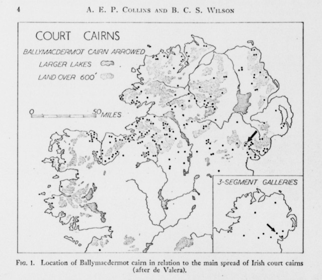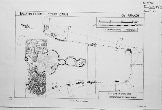 These gorgeous elevations appeared in “The Excavation of a Court Cairn at Ballymacdermot, Co. Armagh” Ulster Journal of Archeology, 1964.