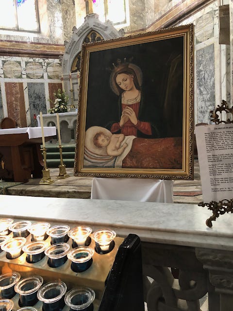 According to that sign, this painting was rescued from the previous cathedral before it was sacked in the Reformation and sent away to keep it safe. Far away in Hungary, the Virgin cried real blood tears as the church burned. Now she’s home.