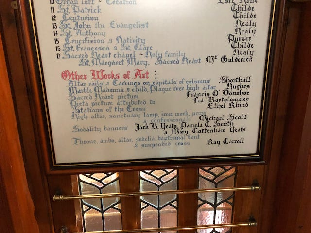 The Church knows people come for the art. That's what the art is for. In this cathedral, immediately on entering you see this elaborate list of art works and artists.