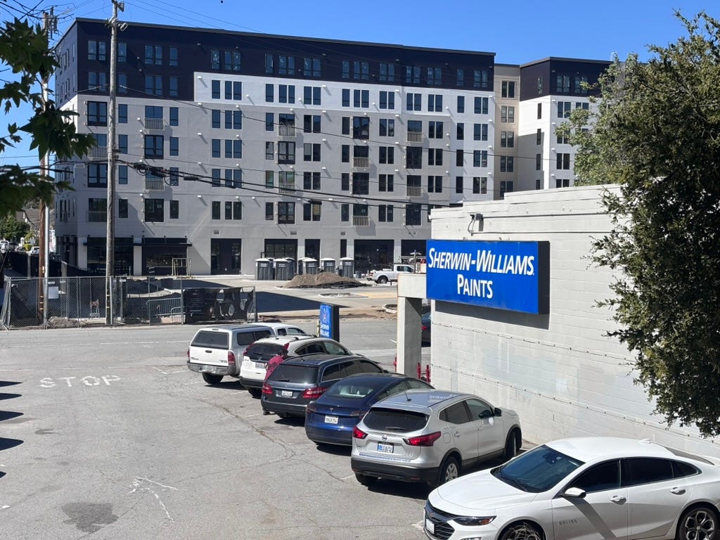 The rear view of the apartments at the Metro. So ugly, and because they are built for poor people, there are no real balconies, just a sliding door. Painting the top story black doesn’t make it any shorter. But I’m grateful for the housing anyway, and Sherwin-Williams.