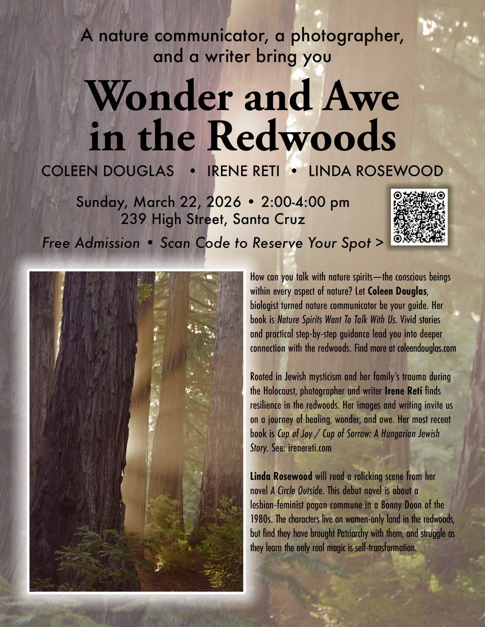 March 22 Wonder and Awe in the Redwoods. This is the Santa Cruz launch of A Circle Outside, an event with my friends Irene Reti and Coleen Douglas. 239 High St, Santa Cruz 2-4pm.