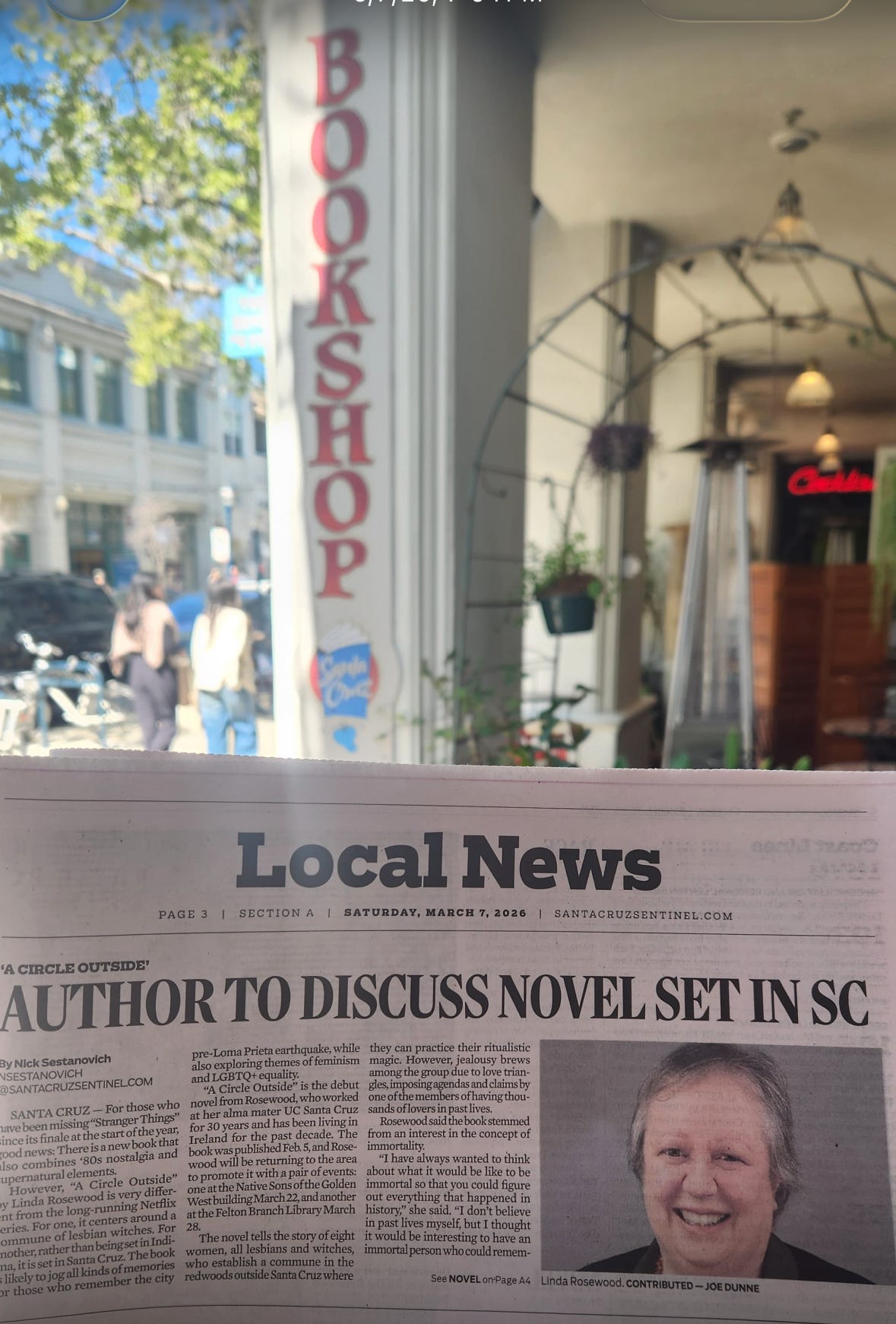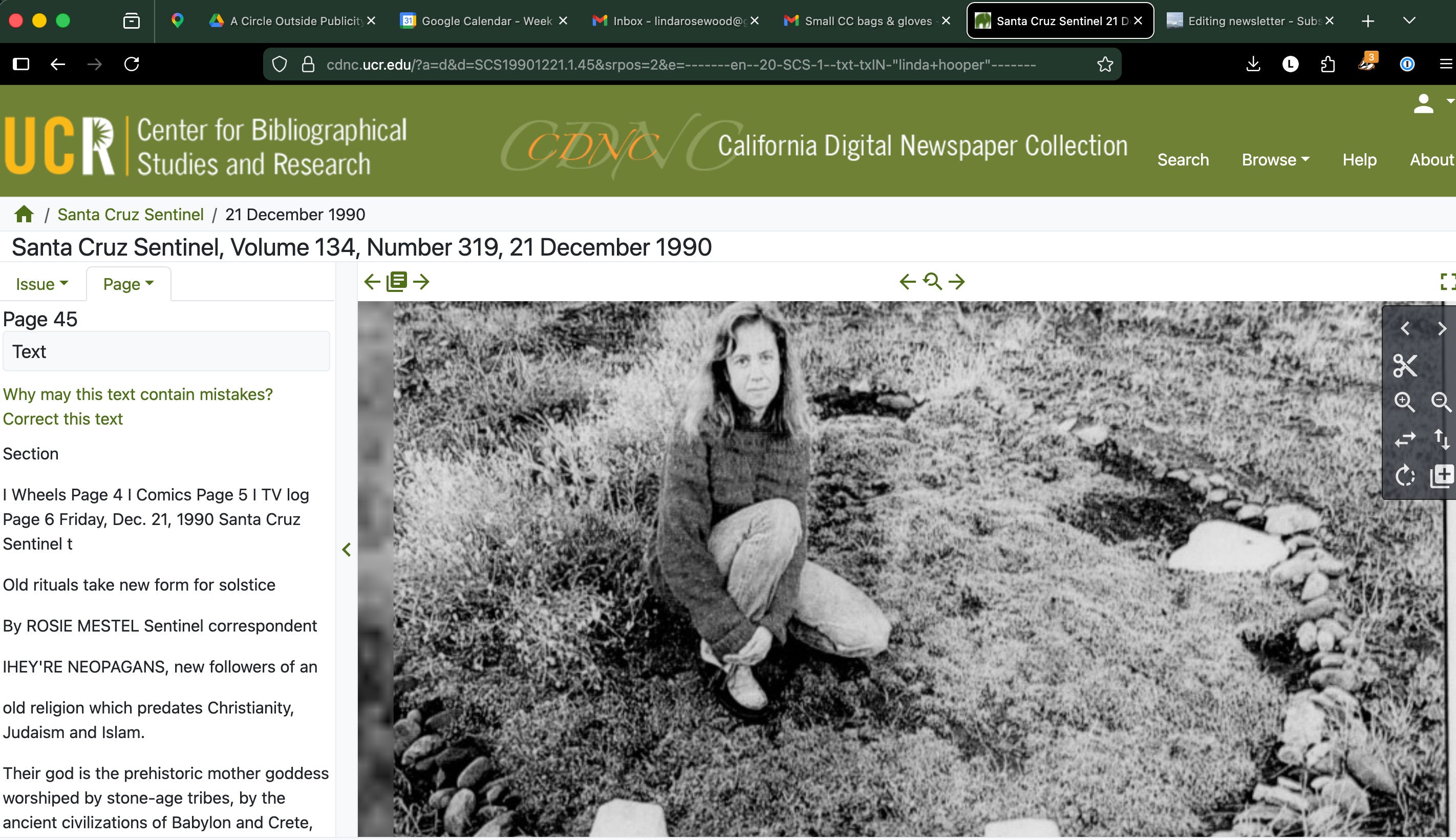 The Sentinel ran a story about A Circle Outside above the fold. It’s behind a paywall, but you can get a subscription for about a dollar. A friend of mine said, “imagine, witches in the Sentinel,” and that reminded me that in 1990 the Sentinel ran a story about local pagans and how they observed Winter Solstice. You can’t read the Sentinel on newspapers.com anymore, but you can still read it in the California Digital Newspaper Collection.