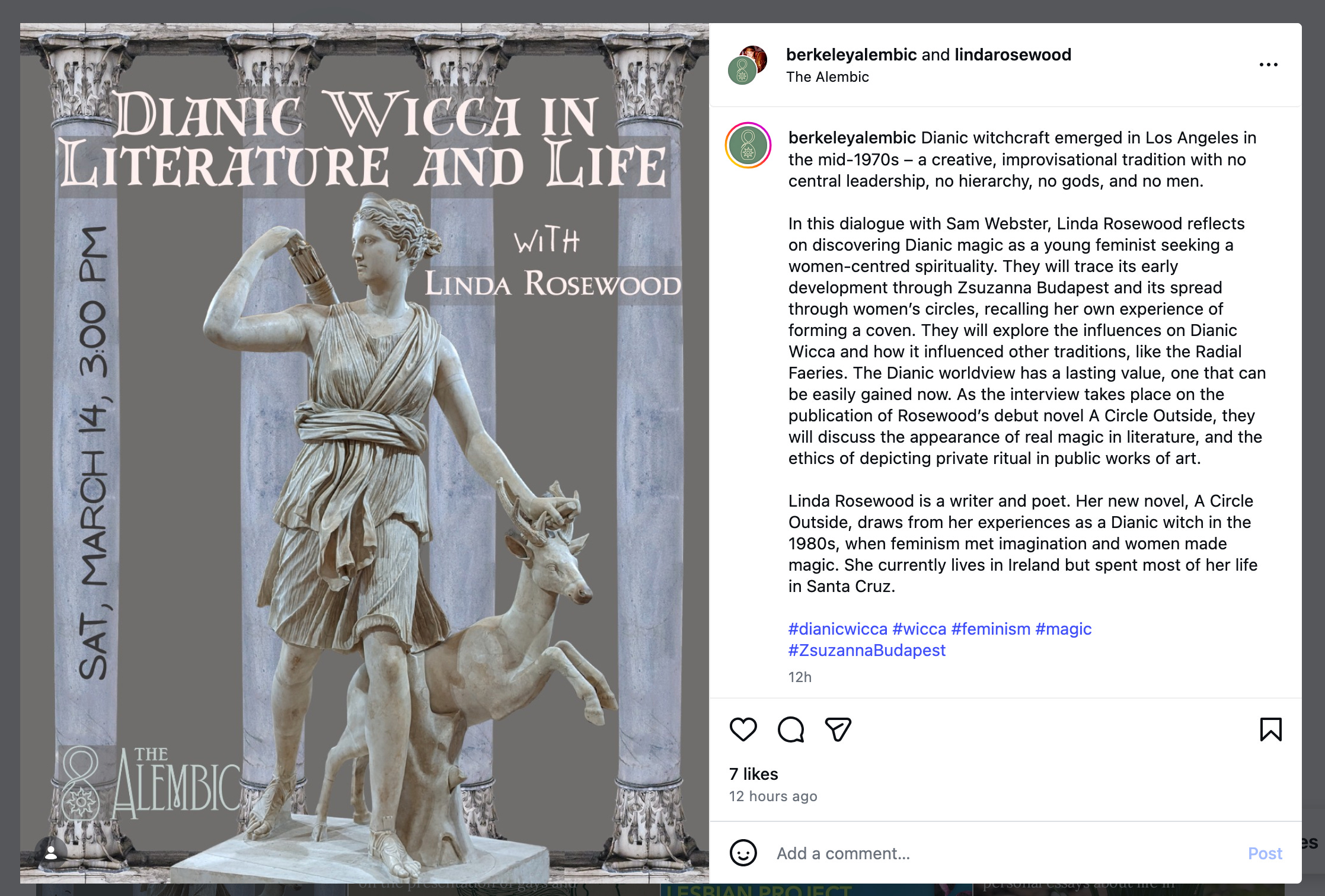 Today I’m headed to Berkeley to be interviewed by Sam Webster of the Berkeley Alembic. We’re going to talk about what I learned from Dianic Wicca when I was in my twenties, where I thought it came from (and where it actually did). I want to talk about the power of saying “No,” and the power of saying “Yes.” I hope we’re not too nostalgic, because women getting together and playing together with intention is an approach for healing and growth that never goes out of style. The talk will be recorded.