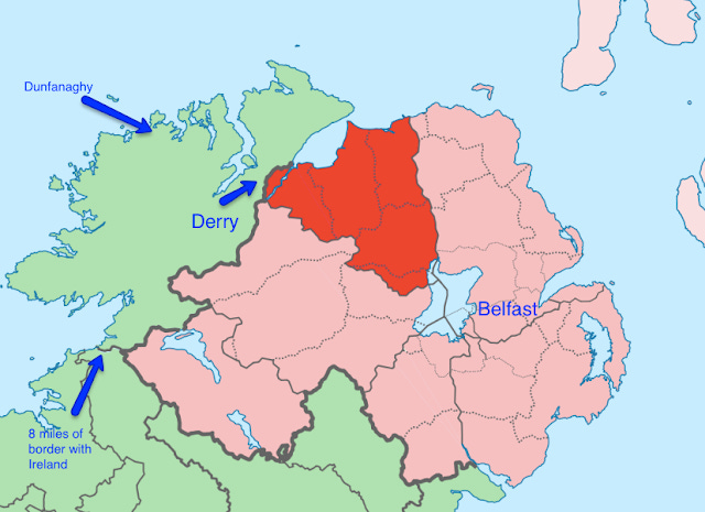 We live in Dunfanaghy, Co. Donegal, which is about an hour and a half from the City of Derry, in Co. Derry shown in red above. So going there is like going to San Francisco from Santa Cruz. Belfast is about three hours from us, which would be like going to Sacramento.