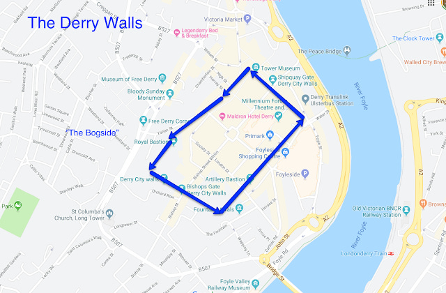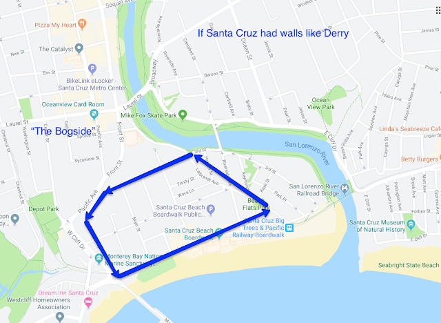 I can't help compare what I learn about Ireland with what I know, so here's a map of what Santa Cruz would look like if we had built our downtown on the island in the middle of our river and put walls around it. The two islands were about the same size, and not too long ago both Derry and Santa Cruz were small enough that everyone knew your business.