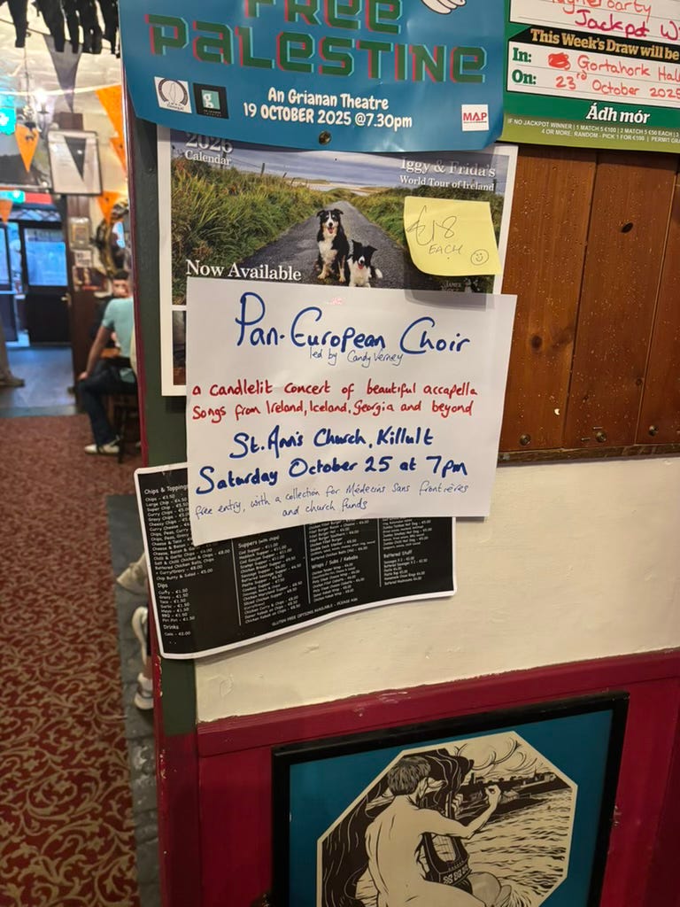 At the Shamrock a few weeks ago I noticed this poster for a free concert. The Pan-European Choir meets somewhere in Europe twice a year for a week, then puts on a concert to the locals. Music Director Candy Verney is exceptionally talented at arranging familiar songs for choirs and training anyone to sing them.