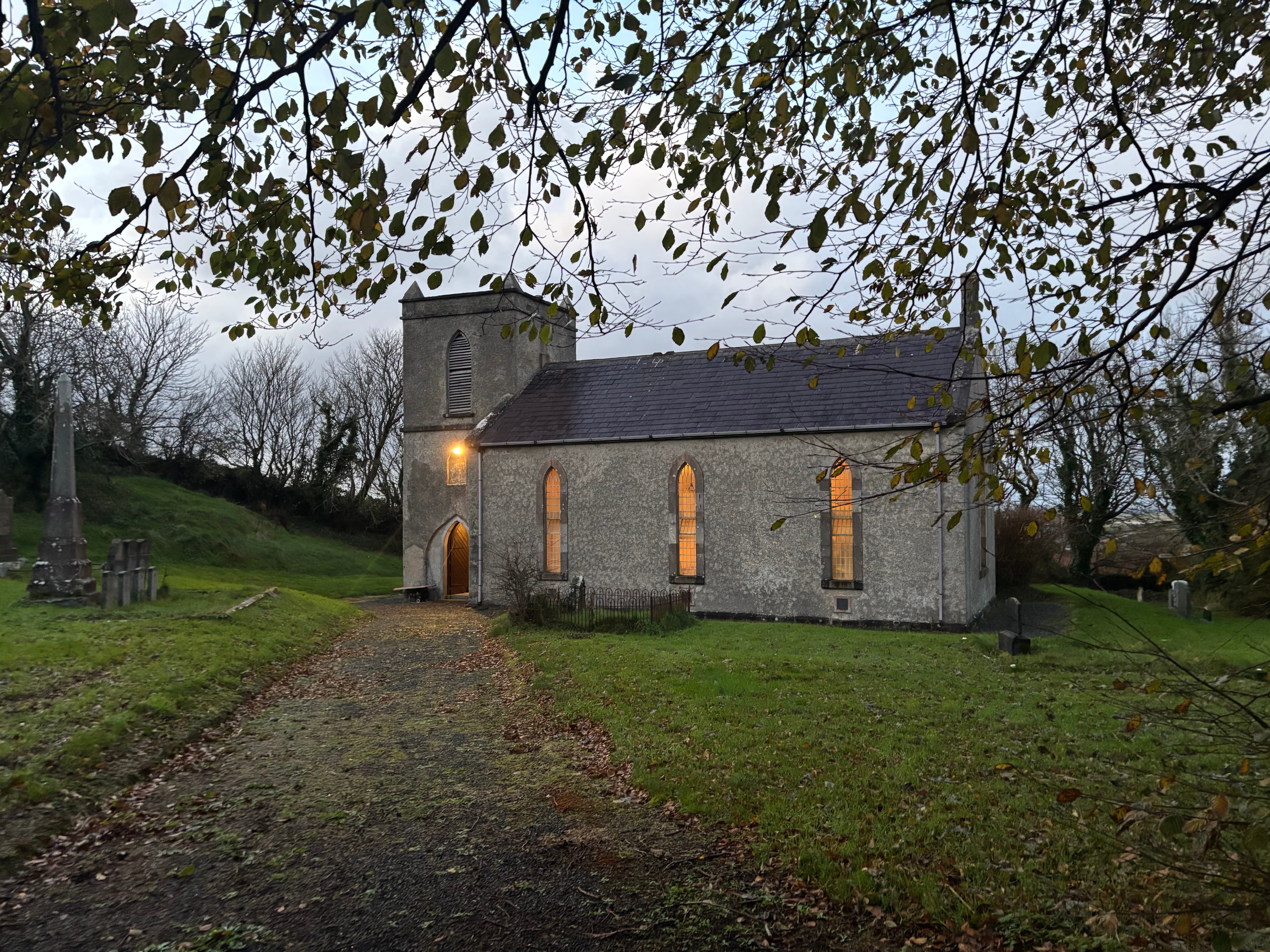St. Anne’s church in Killult has no electrical service. The light in the windows in that picture is produced by a noxious generator. Before the concert starts, the priest lights the candles in four candelabra, then shuts off the machine.