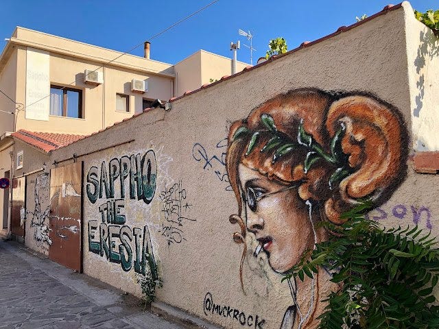 Last week, Mary Beard’s “Instant Classics” podcast featured Sappho, and it reminded me of that time when I attended the International Women's Eressos Festival in Sappho's birthplace, Skala Eressos, on the island of Lesbos.