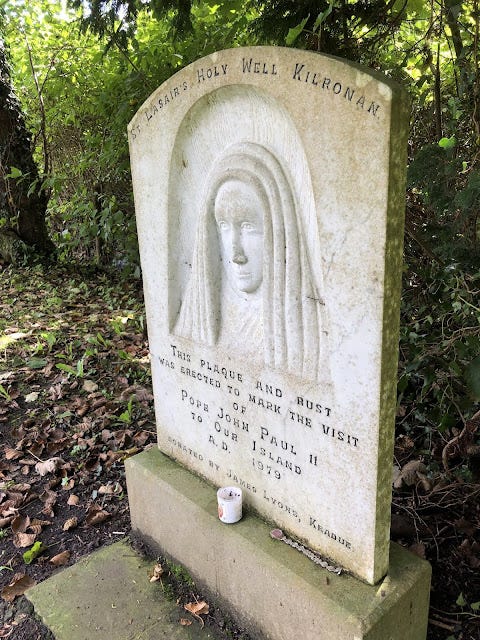 At wells with elaborate folklore rites you’ll often find a soggy notice from the Bishop—like you do at St Lassair’s—telling you how to use the shrine. This one describes circlings of shrine, well, altar, and cross, ending with thanksgiving for one’s own baptism and contemplation everlasting life in the graveyard on the hill above the shrine. (The Dead there share the sacred ground with a shrine to O’Carolan, the harpist. When I visited his grave, I was able to play a recording of his music from my phone. I’m still amazed by technology sometimes.)