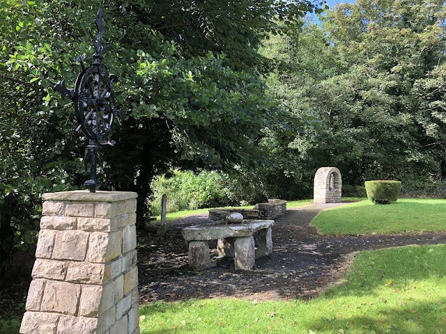 This is a lovely spot, well signed, with wide roads and easy parking. The photo above shows the cross, the altar table and stone, and a shrine to Our Lady. The wall around the well is visible just beyond the table.