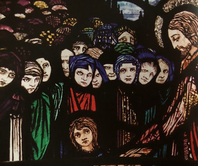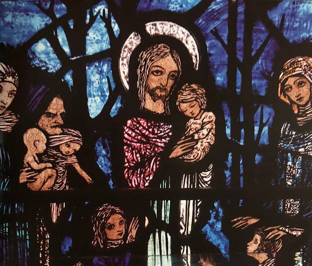 In some windows, I recognize events from the lives of Jesus and Mary. This one is about where Jesus instructs his followers to provide childcare.