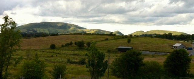 This is Keash, in Sligo, one of many places in Ireland where the goddess’s breasts are visible on the horizon. Here, her pregnant belly rises to the sky, and she throws her head back in labor. I contemplated that screaming mountain outside John’s house and tried to integrate what I had experienced that morning on Carrowkeel.