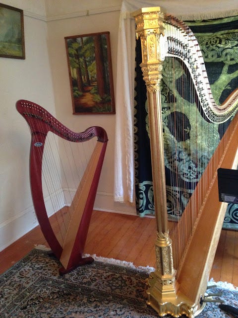 Claire’s harps in our living room