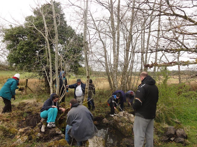 One time, the Bards in the Woods looked for a lost holy well he had seen on the Ordnance map. We found it, choked with its own vandalized stones. To the scandal of a trained archeologist who happened to be with us, we lifted the stones from the well and restored it.
