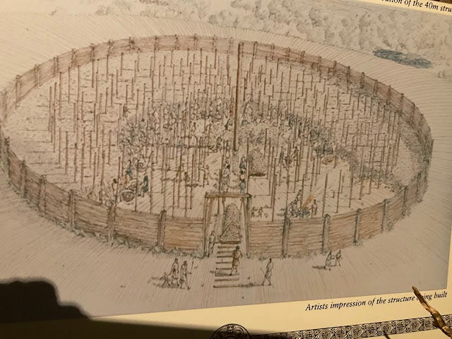 That drawing shows a palisade and a forest of pillars surrounding a central pillar. Did it have a roof? Was it a temple? Was it a stadium?