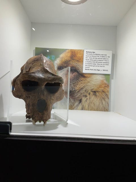 That’s the skull of a Barbary ape, from Gibraltar. What was a monkey doing in distant Northern Island? Performing in the freak show, that's what. No mystery there. Emain Macha keeps a bigger secret, and that’s this: